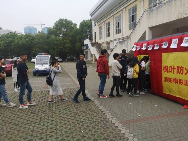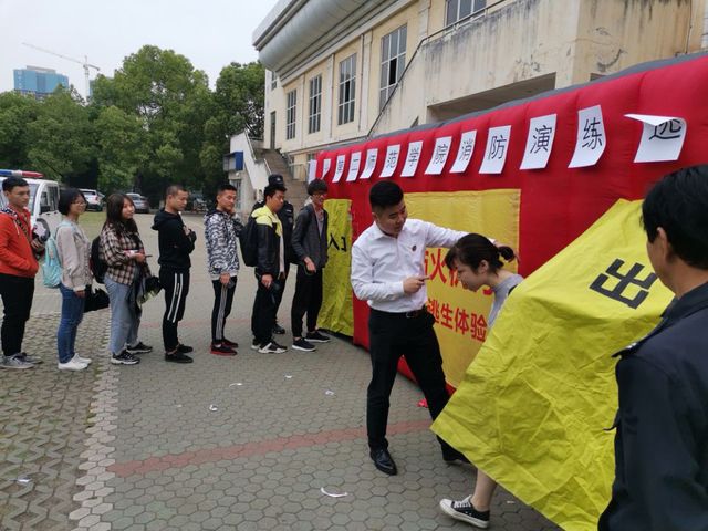 防火教员姜建军通过一个个火灾案列,生动的向同学们介绍火灾的危害性、火场逃生方法及消防器材的使用方法。本次演练活动,综保处通过体验式消防逃生屋模拟火场逃生现场环境,同学们积极踊跃排队体验。