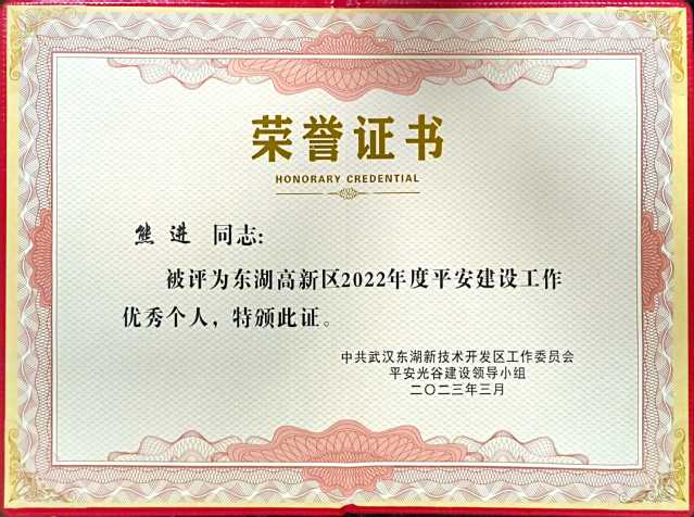 近日,我校再次被武汉东湖新技术开发区工作委员会平安光谷建设领导小组授予“2022年度东湖高新区平安建设优胜责任单位”荣誉称号。保卫部(处)秩序科科长熊进授予“2022年度东湖高新区平安建设工作优秀个人”。