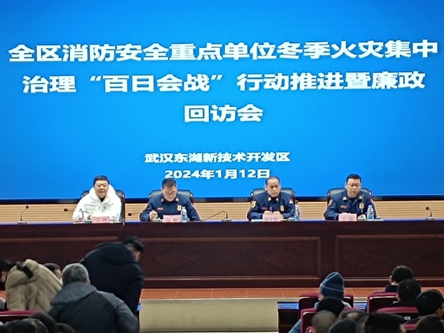 1月12日上午,在图书馆一号报告厅召开东湖高新技术开发区消防安全重点单位冬季火灾集中治理“百日会战”行动推进会。